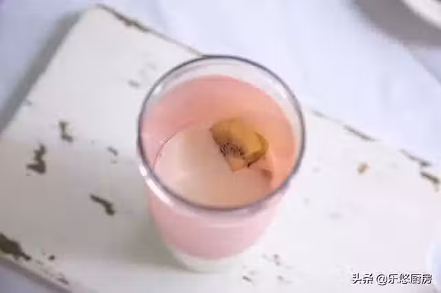 第三步:把留下的那一片獼猴桃貼在杯子內壁,然後把榨好的奶昔倒入杯子,這一杯營養又清新的奶昔就做好了。