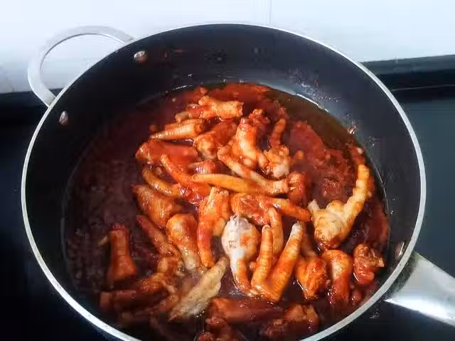 8、2分鐘後,倒入沒過雞爪一大半的水,大火煮沸後,蓋上蓋子,轉小火燜煮6分鐘