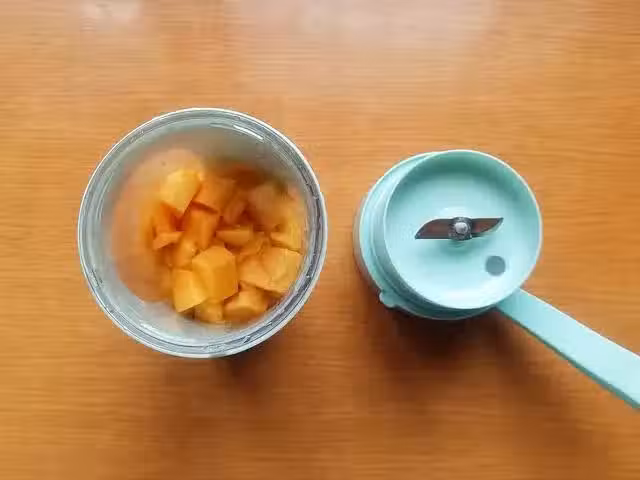4、將打好的芒果泥倒入鍋內,再加入泡軟的吉利丁片和30克的細砂糖,開最小火,一邊畫圈圈攪拌,一邊加熱,直到吉利丁片和細砂糖完全融化,就可以將芒果泥盛出待用了。這一步千萬不可以用中火或者大火,因為溫度過高,容易讓吉利丁片失去凝固的作用