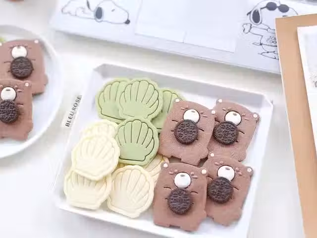 4、半小時後取出面片(此時烤箱預熱150度上下火),用餅乾模具壓出形狀來,抹茶味的和可可味的,做法與原味相同,將它們同樣用餅乾模具壓出形狀來,放在透氣烤墊上,送入烤箱中層,上下火150度,先烤5分鐘,再轉130度,再烤15分鐘