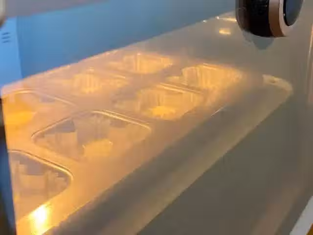 10、蛋糕烤好後取出,把模具在桌面上輕震兩下,震出熱氣後,再將它側身擺放在模具內,晾涼