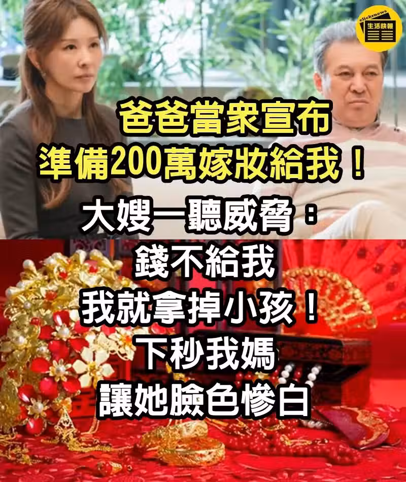 爸爸當眾宣布「準備200萬嫁妝給我」! 大嫂一聽威脅「錢不給我,我就拿掉小孩」下秒我媽讓她臉色慘白