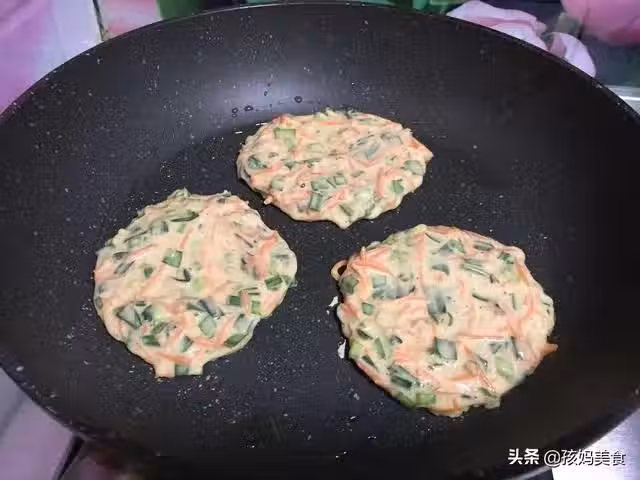 7、平底鍋表面抹少許油,用勺子舀適量麵糊倒入鍋中,用勺底抹平表面。