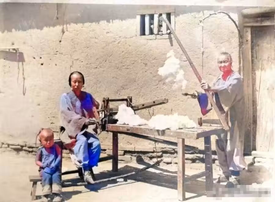 彈棉花的兩個婦女,她們應該是婆媳關系,凳子上還坐著一個小孩子,在當時彈棉花是一門手藝活,現在會彈棉花的越來越少了,在那個時候家家都要彈棉花,要翻新或者做被子做棉衣服。