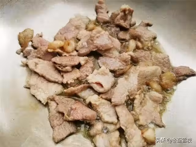 5.鍋內再添加少許油,下入肉片翻炒,將肥肉翻炒出油,下入薑絲和蒜片爆香。