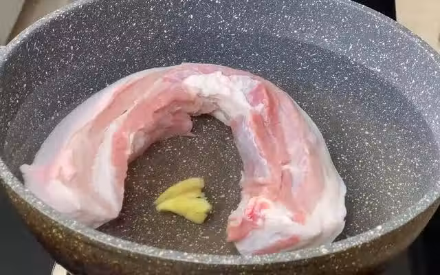 將五花肉清洗乾淨再冷水下入鍋中,並放入薑片,倒入適量料酒為的是去除腥味,等煮出血沫後撈出再用清水沖洗下。