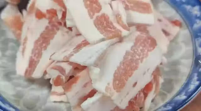 3、五花肉切成薄片,然後把新鮮的五花肉放入冰箱中,冷凍半小時再拿出來切,這樣切成了薄片薄厚都是均勻的,而且其實也比較方便,切好後放入碗中備用。