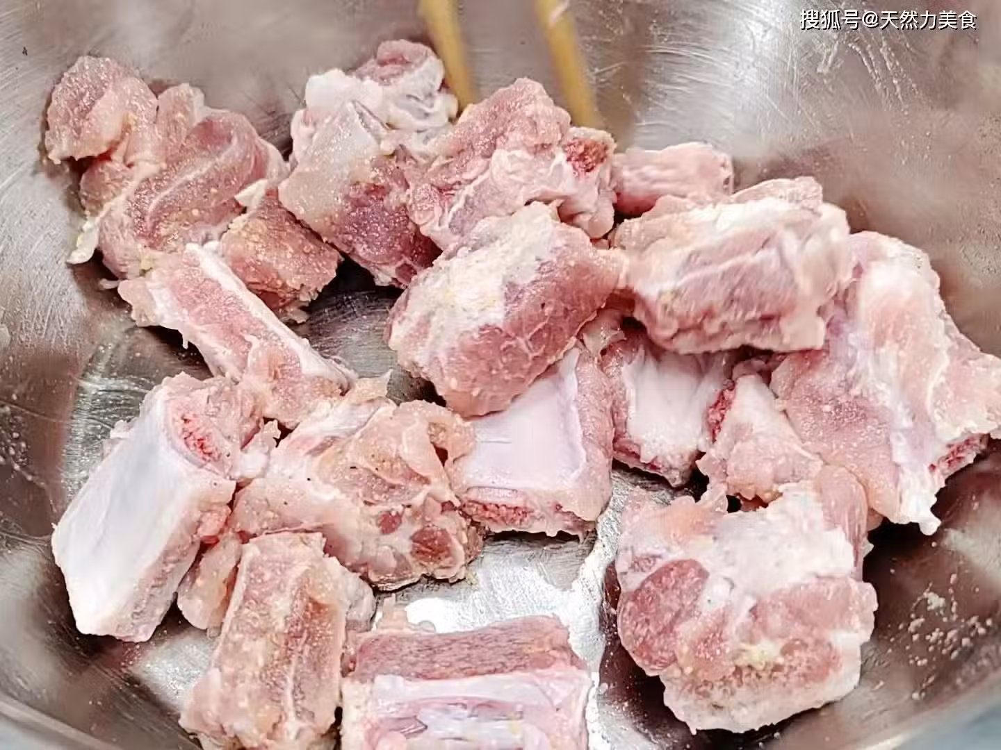 14、接著把一半的豆豉醬倒入排骨中,攪拌均勻,讓所有的排骨都很均勻地接觸到豆豉醬的味道。攪拌均勻後加入3克玉米澱粉,攪拌均勻,讓所有的排骨都能均勻地裹上一層薄薄的澱粉,加澱粉可以讓排骨更滑嫩,也可以鎖住排骨中的水分不流失。最後加入15克花生油,攪拌均勻,加花生油可以增香,也可以讓菜肴更明亮好看。攪拌均勻後放一旁腌制15分鐘。