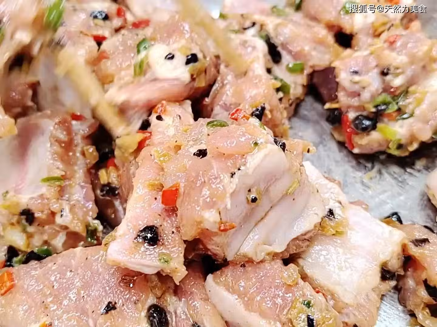 15、把處理好的芋頭平鋪在盤中,把好看些的圍在邊上,把不好看的放中間鋪平。把腌制好的排骨放在芋頭的上面,放的時候要平鋪,排骨與排骨最好不要疊放在一起,否則排骨的成熟度就達不到一致。最後把剩下的豆豉醬鋪在排骨的上面。