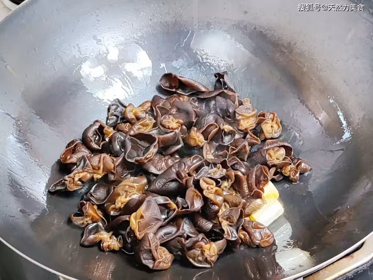 6、接著加入2克食鹽提味,2克白糖和味,20克生抽提味,翻炒幾下,把調味料炒均勻。翻炒均勻後院加入150克清水,然後保持小火燒2分鐘,把木耳燒至入味。