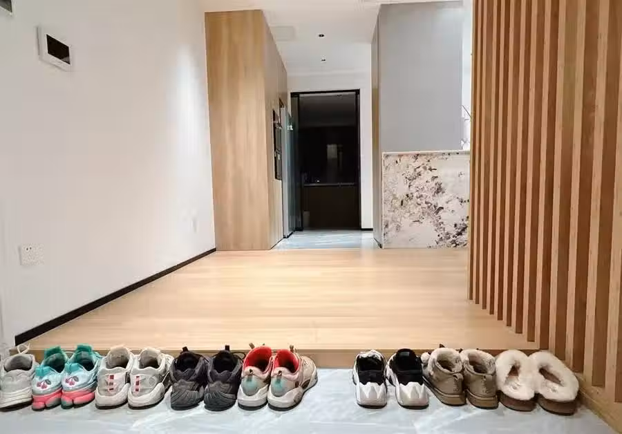 玄關這部分可以不裝地暖,利用地暖的高度來打造一個下沉式玄關。