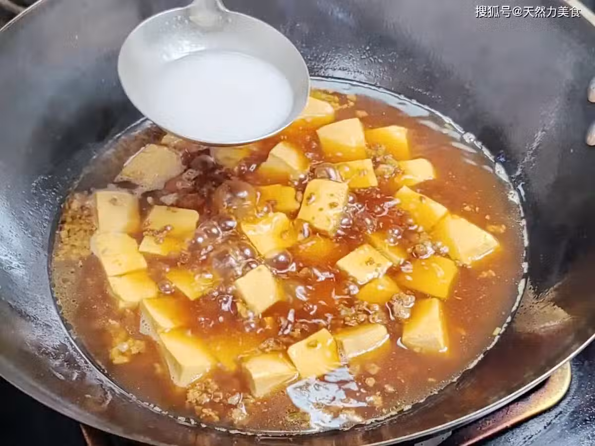 12、水澱粉加完後湯汁也變得有些濃稠了,這也就意味著可以出鍋了,出鍋前把蔥花加進去,再淋入5克芝麻香油提香增亮,推動幾下後就可以出鍋裝盤,這樣一道好吃下飯的肉末豆腐就做好了。