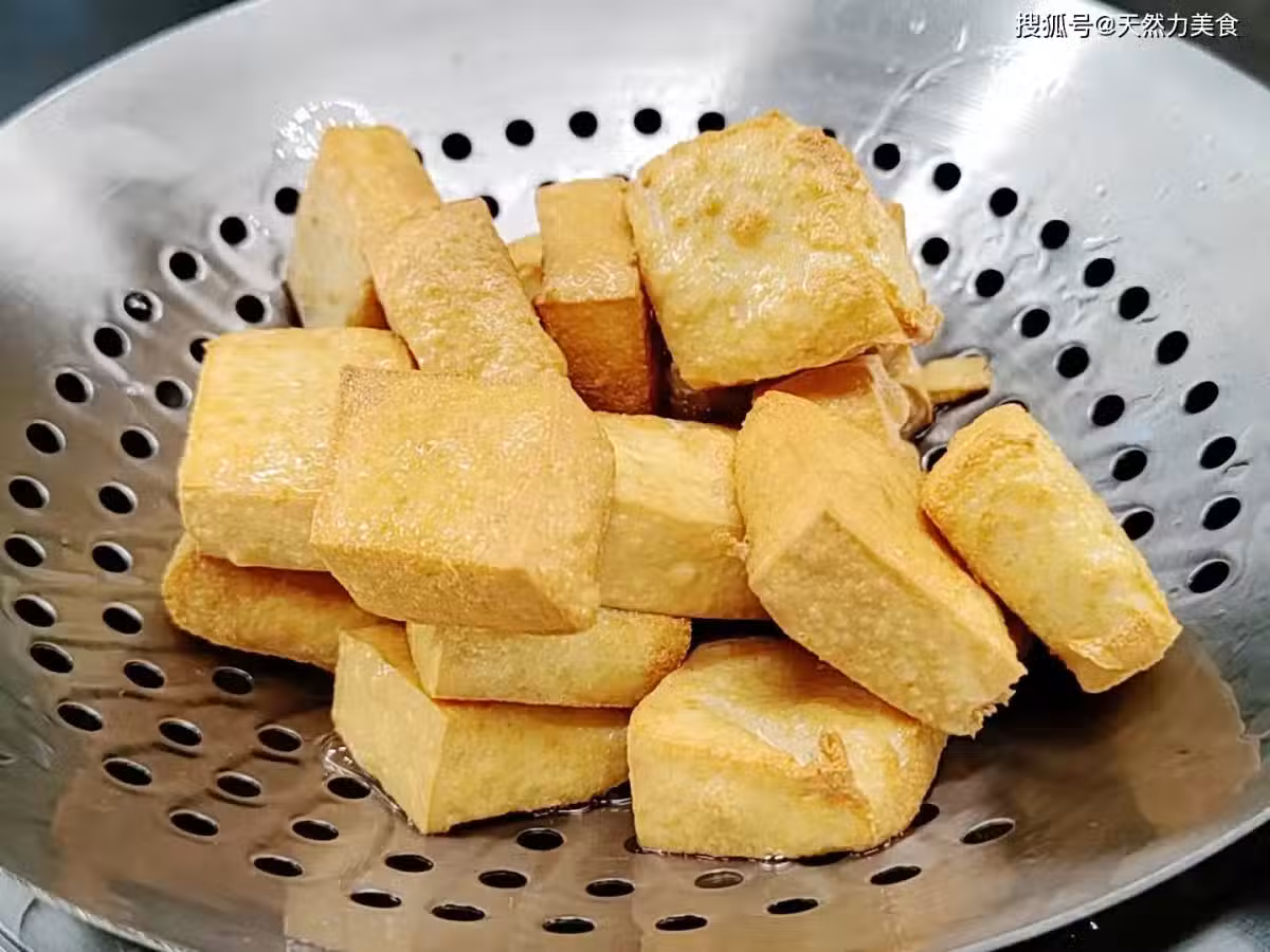 4、把炸好的豆腐平鋪在金針菇的上面,擺放的時候儘量擺放均勻一些,這樣豆腐才能更均勻吸收湯汁的味道。