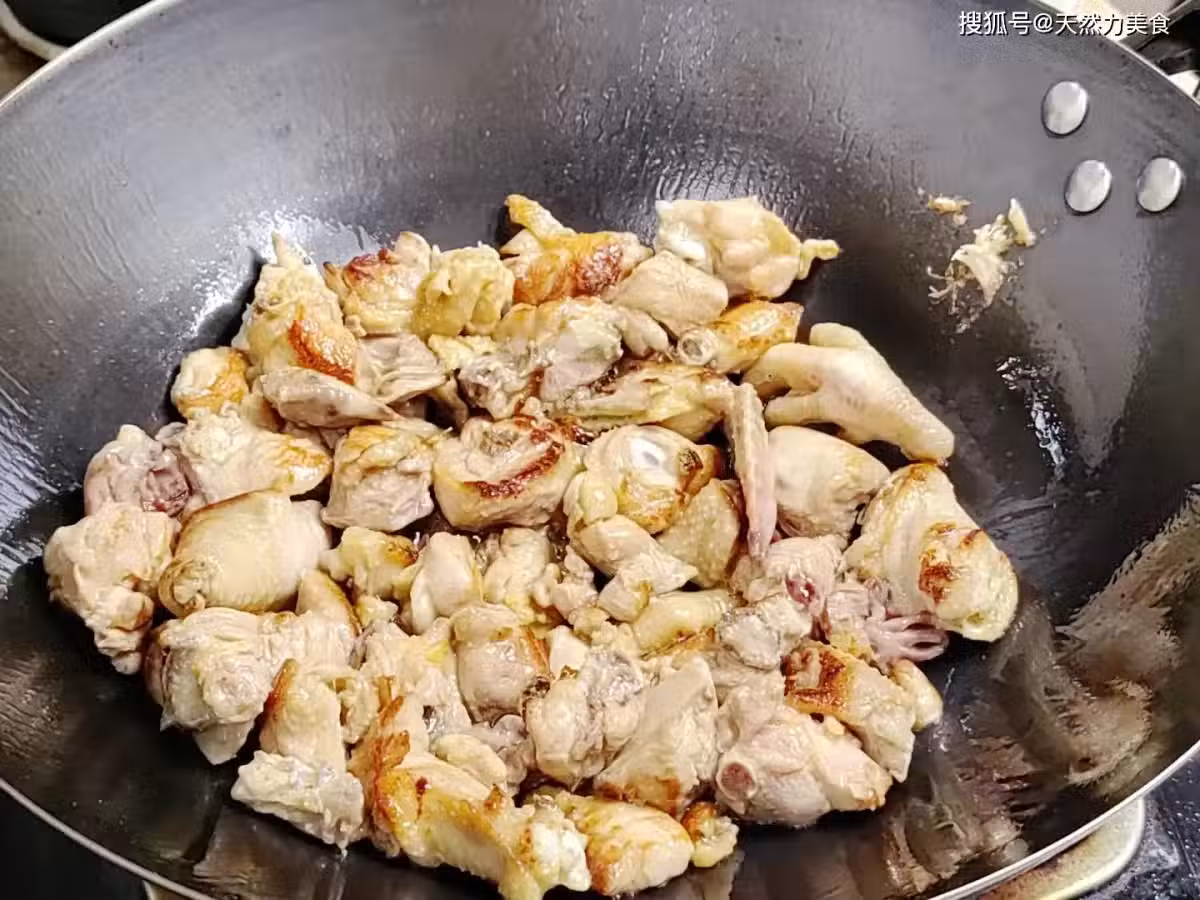 4、接著把沙姜、蒜子和生薑一起倒進鍋內,和雞肉一起翻炒,炒出配料的香味,大概炒上20秒左右的時間,香味就能出來。