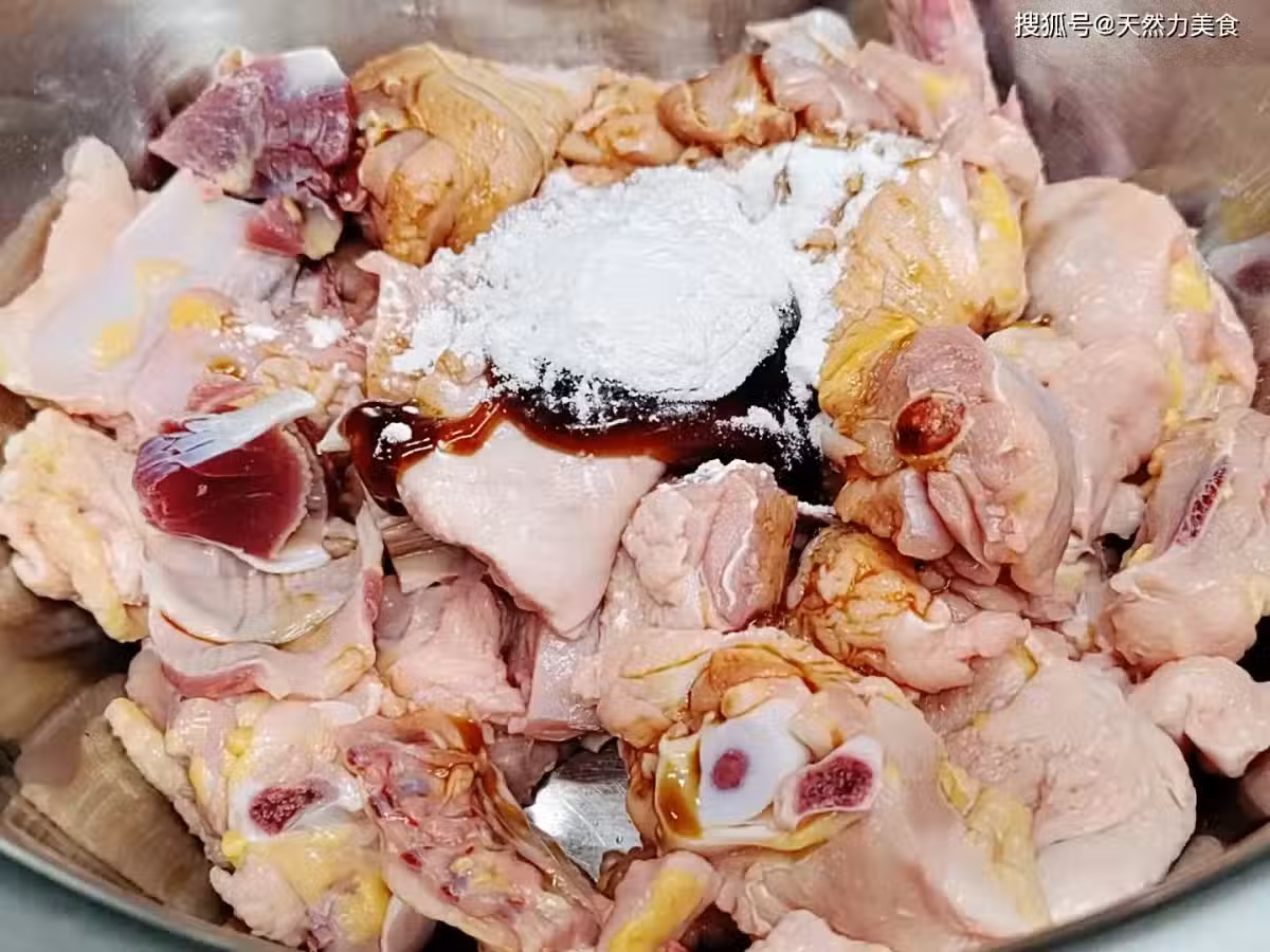 5、攪拌均勻後加入20克花生油,花生油有增香去腥的作用,也可以鎖住雞肉中的水分,還可以在後期煸炒的時候更不會相互粘在一起。攪拌均勻後放一旁腌制20分鐘。