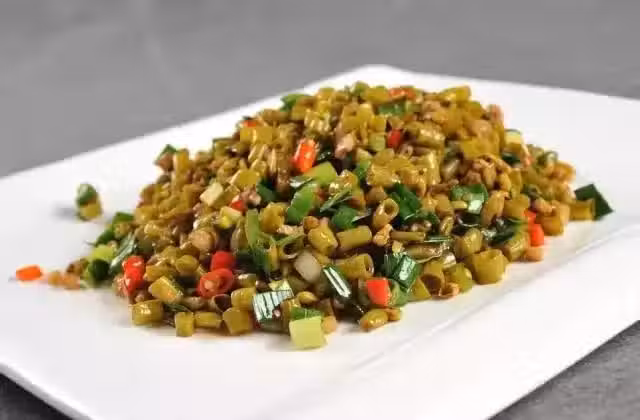 3.鍋內放豬油燒熱,倒入肉末,加鹽稍炒,再放入酸豆角合炒,接著放蒜泥、干椒末、醬油拌炒,加清水50克燜熟,收干湯汁,放味精起鍋即可。