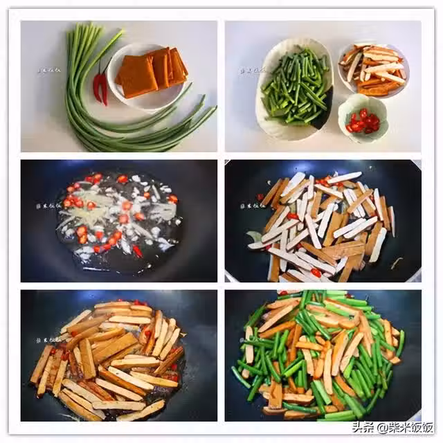 5,最後加點鹽調味,炒勻即可。新鮮蒜苔比較好熟,如果是冷庫出來的蒜苔,可以將蒜苔和香乾一起下鍋炒。