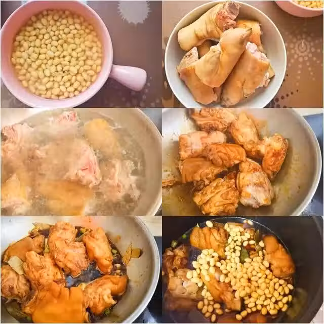 4、放入豬蹄上糖色,放入蔥姜和香葉,淋入生抽,料酒,鹽,加入清水沒過豬蹄並燒開,放入泡發的黃豆,轉入高壓鍋燜50分鐘,就可以了。