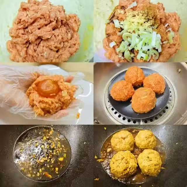 【食材】肉餡,油菜,姜,蔥,蒜,鹹鴨蛋黃,生抽,老抽,白糖,胡椒粉,十三香,鹽,麵包糠,澱粉