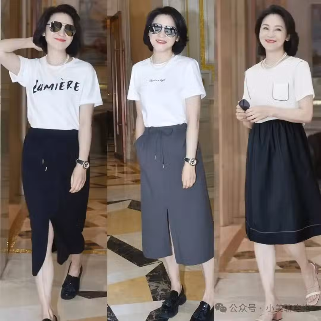 簡約的白T,可以選擇一條黑色的直筒裙,黑白分明的配色看起來很高級,又可以穿出利落幹練的職場OL范兒,不裝嫩,卻很減齡。