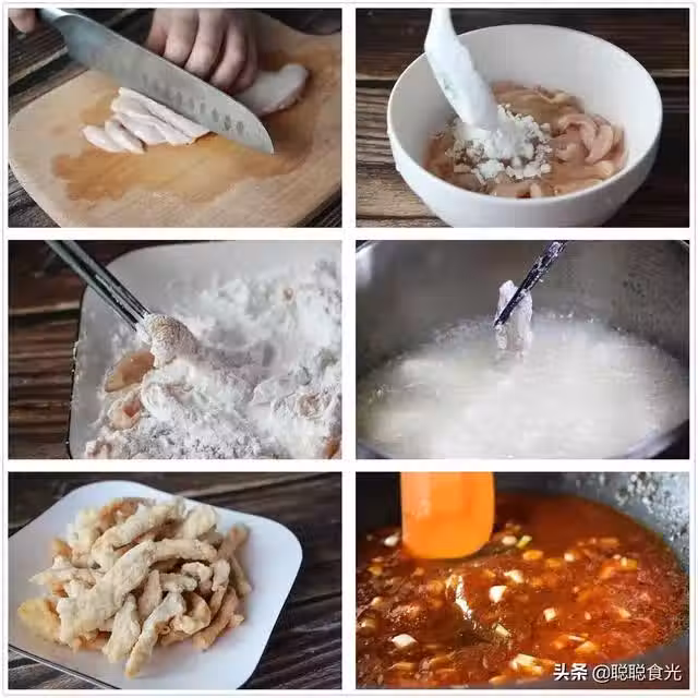 4、鍋里加入油燒至七成熱,把掛好澱粉的雞柳依次放入油中炸熟,炸的過程中肉不要一次全放入,防止互相粘連。