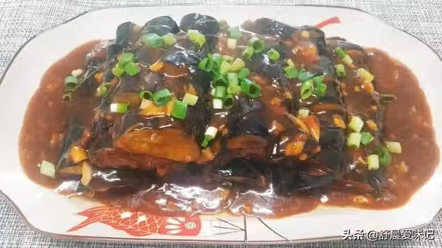 9.把炸好的茄子碼放在盤子上,然後均勻淋上炒好的醬汁