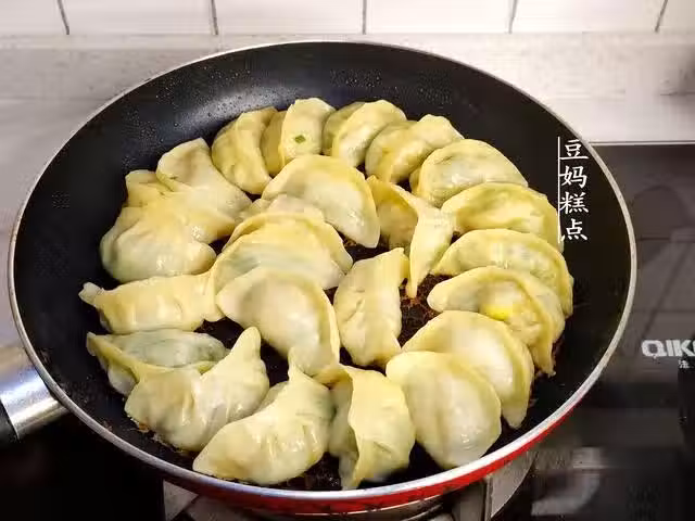 1、取一平底鍋燒熱,倒適量油晃平,擺入餃子。