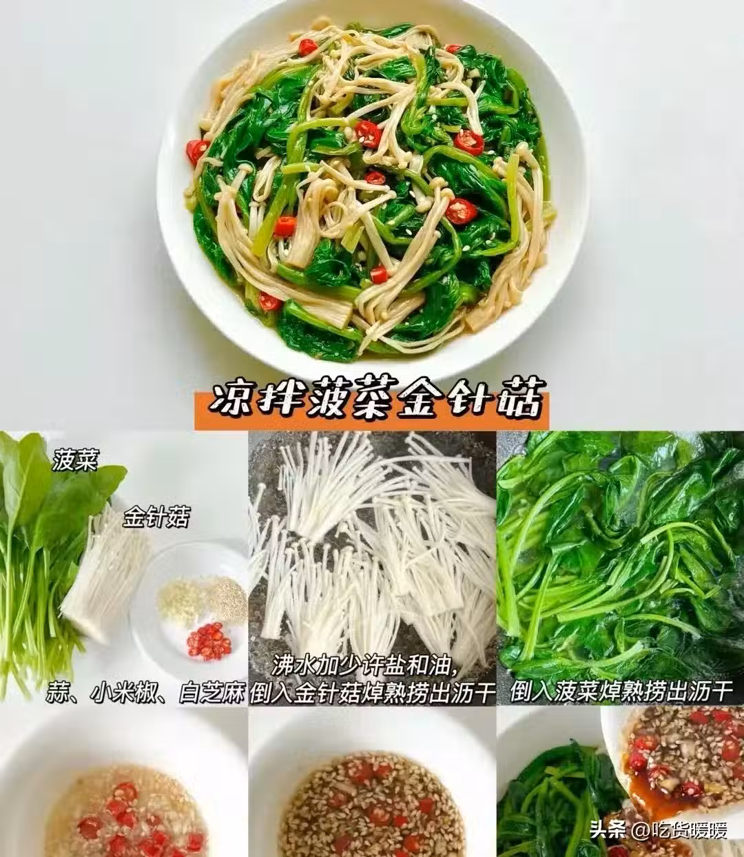 蒜、小米椒、白芝麻倒入金針菇焯熟撈出瀝干倒入菠菜焯熟撈出瀝干加入2勺生抽、 蒜末、小米椒、 2勺香醋、半勺蚝油、 白芝麻淋上熱油 半勺糖、少許鹽拌勻 菠菜金針菇淋上醬汁拌勻。