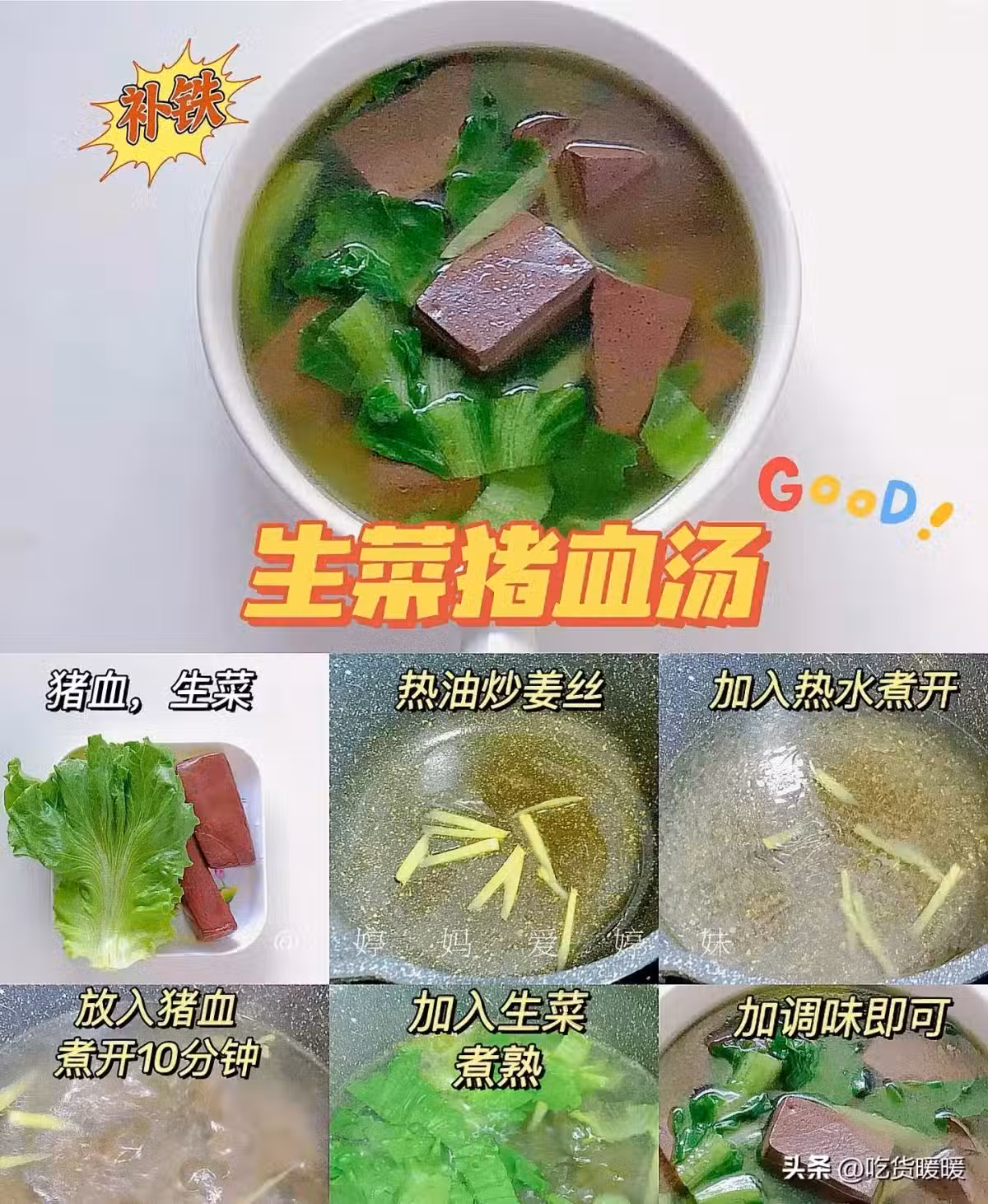豬血,生菜 熱油炒薑絲 加入熱水煮開 放入豬血 加入生菜 加調味即可 煮開10分鐘 煮熟。
