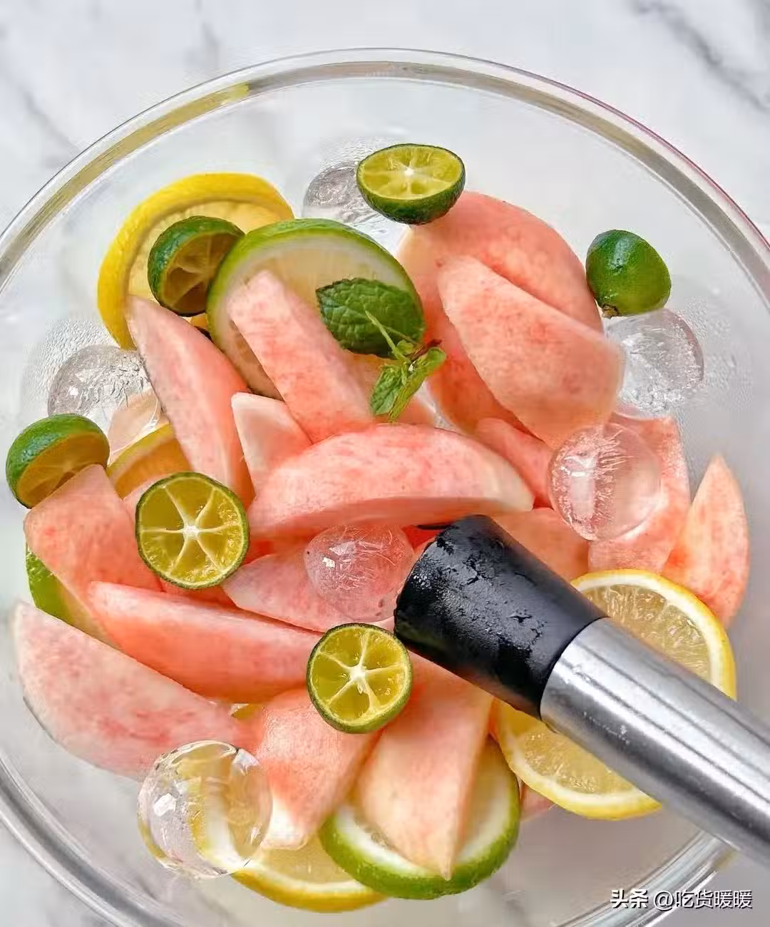 食材:桃子、檸檬、香水檸檬、小青檸、薄荷、冰塊、檸檬花果茶