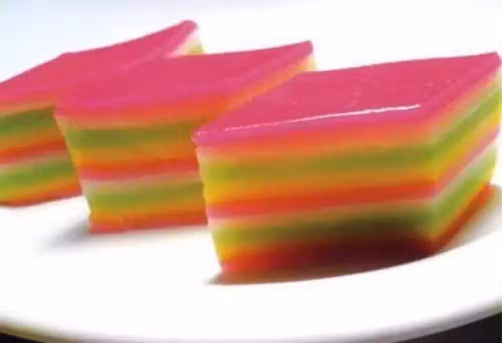作者準備的是紅、青、原材料,分別放入三個碗,分三次倒入就產生九層了。
