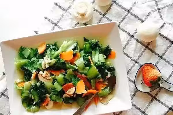 青菜一把,口蘑3-4個,胡蘿蔔半根,植物油,鹽