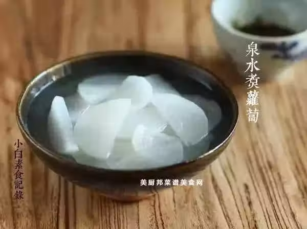 白蘿蔔去皮,對半切開,然後切0.5厘米的片,這樣的形狀比較容易夾取。放入鍋中加礦泉水沒過,蓋上鍋蓋開中火煮20分鐘即可