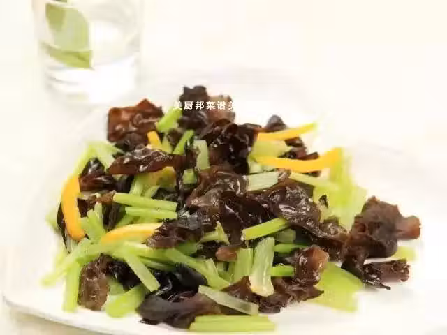 3.熱鍋放油,先放芹菜翻炒,再放木耳,翻炒幾次後,放一點水再炒至熟。