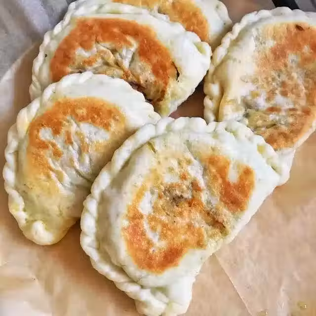 7. 烙(200度,鍋底不能放油,頂面刷油,烙制金黃色馬上出鍋)