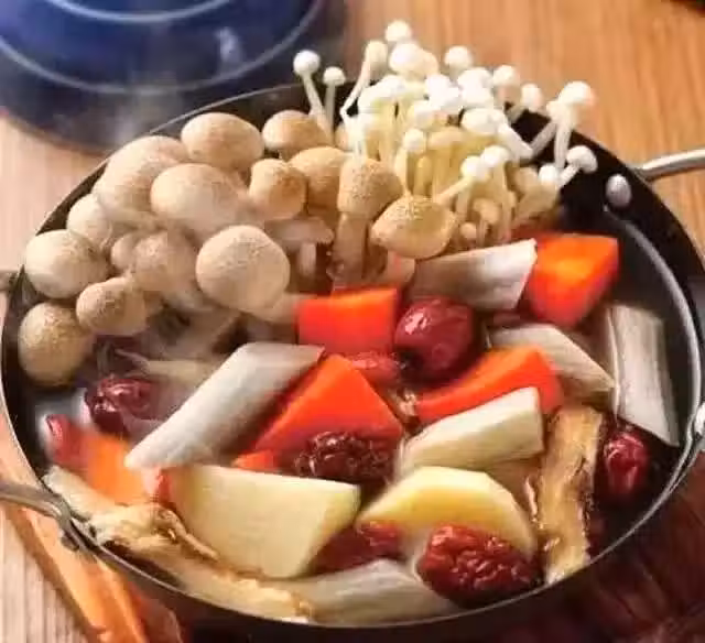 食材:山藥120克,牛蒡100克,胡蘿蔔100克,秀珍菇80克,金針菇80克,當歸2克,枸杞2克,紅棗6顆,薑片5克,素高湯500毫升,鹽1/2茶匙