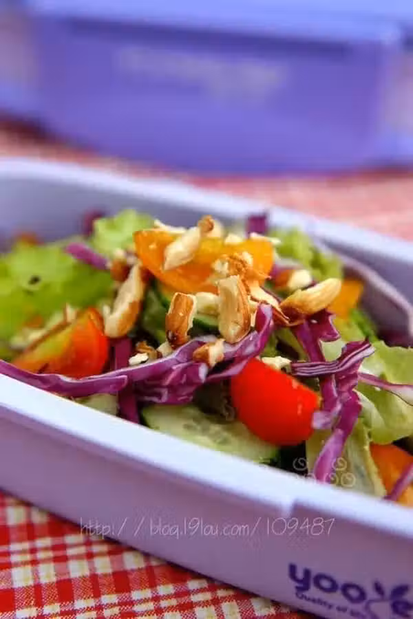 3、蓋上蓋子,上下左右搖,把蔬菜和調味料搖均勻了裝盤,一把堅果用刀壓碎,撒在沙拉上即可。