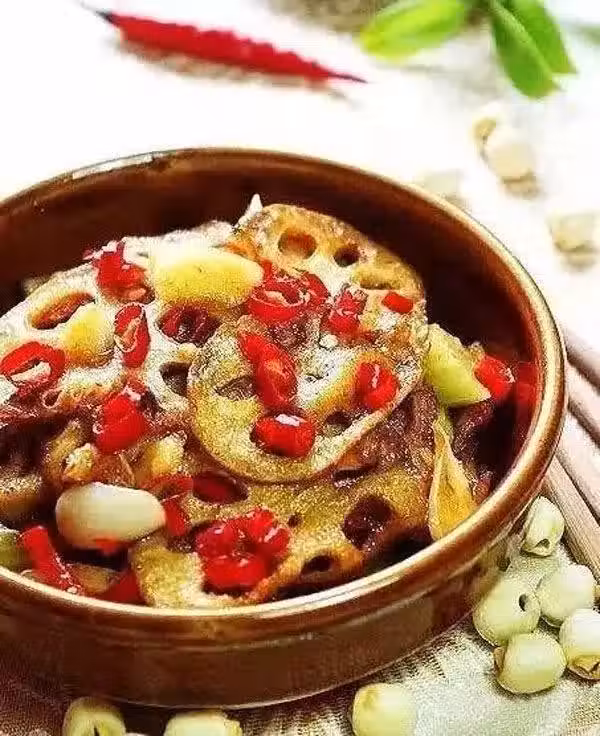 1.蓮藕洗凈去皮,切薄片,芹菜洗凈斜切切段,小米椒切碎,姜切片;