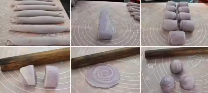 做法:1. 油皮包入油酥,收口朝上,壓扁,搟成橢圓薄片,長的一邊捲起,像卷瑞士卷,收口朝下,蓋上保鮮紙,鬆弛20 分鐘。2. 休息好的麵糰,收口朝上,搟成長形,短的一邊捲起,蓋上保鮮紙,再鬆弛20分鐘。3. 麵糰中間切斷,切面朝上,搟成圓片,翻麵包入餡料,放在鋪紙的烤盤上。4. 送入預熱烤箱160c-180c,烤25分鐘至表面有明顯分離線條。