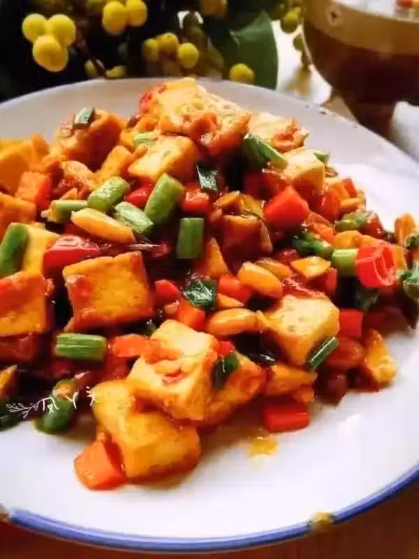 北豆腐一塊/紅蘿蔔適量/蘆筍三根/香菇一朵/熟花生米少許/紅椒少許/生抽少許/生薑少許/玉米澱粉少許