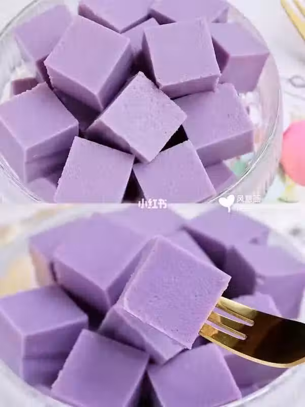 4. 保鮮盒墊上油紙,牛奶紫薯液過篩倒入盒內,蓋好蓋子,冰箱冷藏3~4小時凝固後切塊。