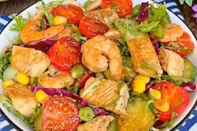 食材:雞胸肉一塊,熟蝦仁,苦菊適量,紫甘藍,黃瓜,聖女果,玉米粒,豌豆粒。 做法:
