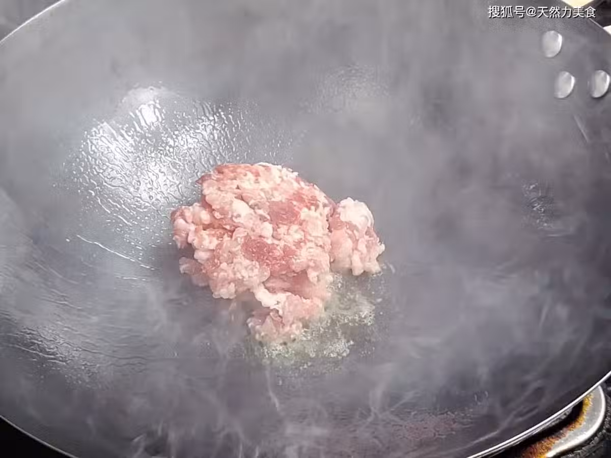 5、我們在煸炒肉末的時候不要著急,全程都用中火,一定要把肉末煸炒到酥香,這樣吃起來不僅口感好,香味也好。把肉末一直煸炒到外表色澤金黃,而且肥肉中的油脂也都基本上都煸炒出來了,有這個程度就是我們想要的效果。