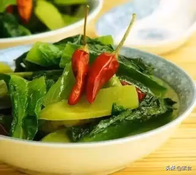 6:再加入萵筍葉大火翻炒片刻,撒蘑菇精拌勻關火。