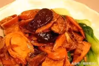3、坐鍋點火倒油,下姜爆香,放入素雞、冬菇、春筍燒兩分鐘後調味勾芡出鍋澆在菜上即可