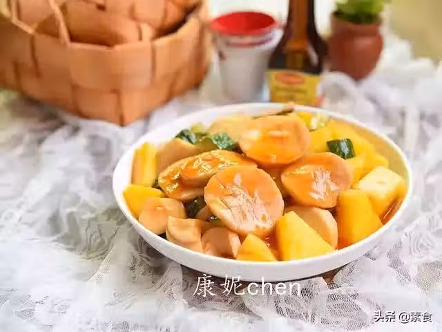 5. 放入青瓜和菠蘿塊,翻炒均勻即可。