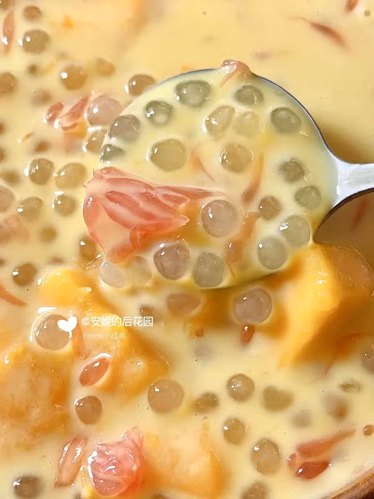 取一半芒果搗成泥狀,碗里再放入西柚粒+西米+芒果塊,倒入椰汁攪拌均勻即可~
