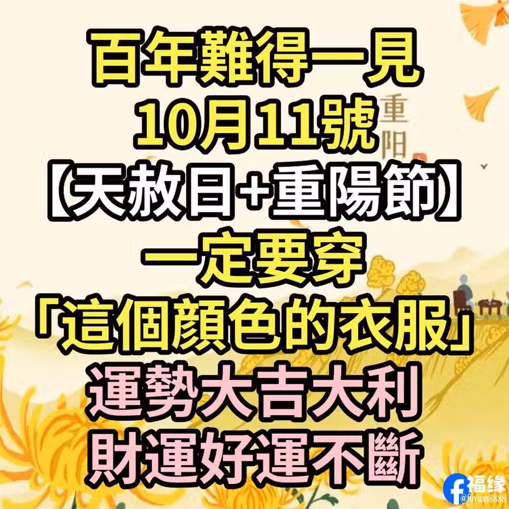 百年難得一見! 10月11號【天赦日+重陽節】一定要穿「這個顏色的衣服」運勢大吉大利, 財運好運不斷!