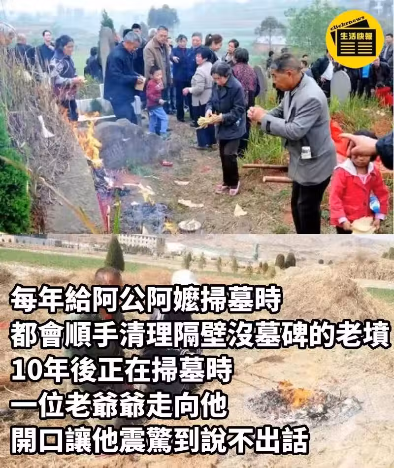 他每年給阿公阿嬤掃墓時,都會順手清理「隔壁沒墓碑的老墳」10年後正在掃墓時「一位老爺爺走向他」開口讓他震驚到說不出話