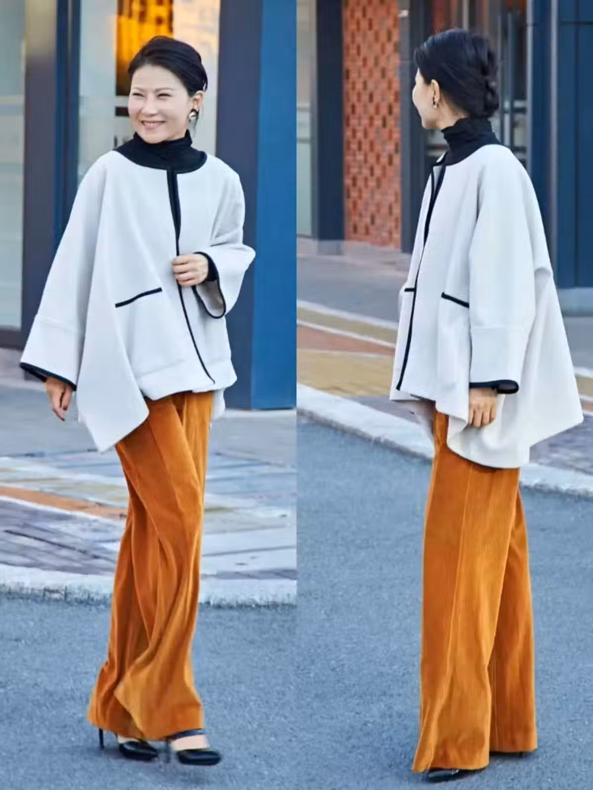 大地色系長褲若是搭配外套,那麼可以優先選擇白色款,比如白色無領過腰短外套。